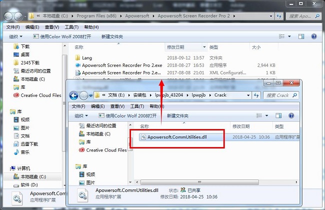 1、回到安装包,将解压文件夹中的Crack文件下的“Apowersoft.CommUtilities.dll”文件覆盖到软件软件的安装目录中,默认路径为C:Program Files (x86)ApowersoftApowersoft Screen Recorder Pro 2