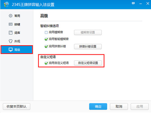 怎样添加自定义短语?自定义短语功能”在右键菜单——设置——高级(如图所示)