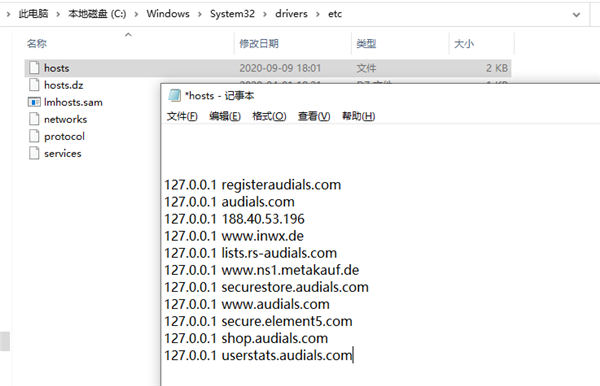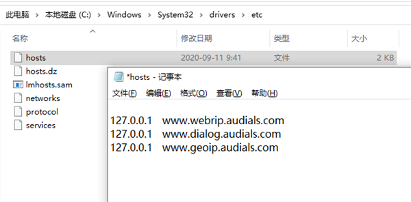 1、下载Audials One Platinum 2021破解版安装包并解压缩,找到C:WindowsSystem32driversetc目录下的Hosts文件,以记事本形式打开添加以下代码127.0.0.1 registeraudials.com