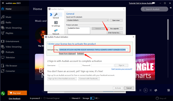 5、点击Enter License Key,将激活码复制到软件中,点击Validate进行验证