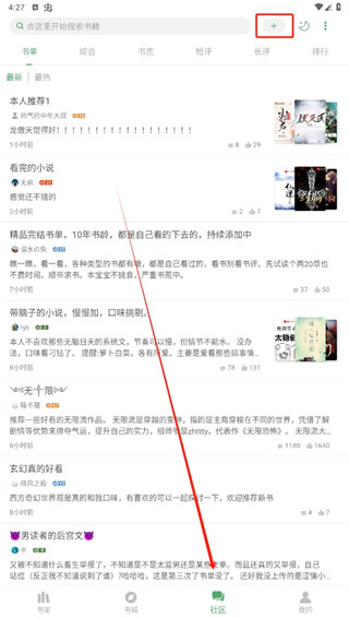 1、打开软件,进入到社区中,点击上方的+号图标,再点击发布书评