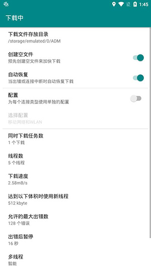 1、ADM Pro下载器官方版可同时三个文件下载。2、通过使用多线程加速下载(9 个线程)。