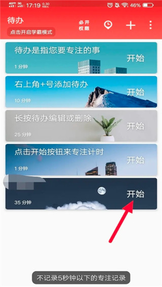 设置完成后,点击新事项的【开始】按钮,即可开始自律时钟。