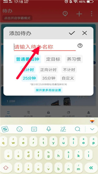 输入待办事项名称,设置闹钟性质,时长等。