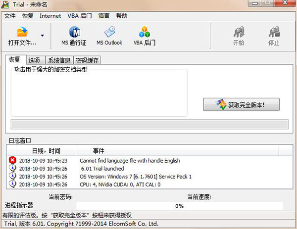 一、破解设置Advanced Office Password Recovery破解版为了缩短AOPR破解文档密码的时间,使用之前应该估计一下密码的构成特点,然后合理选择将要使用的破解策略。假如密码可能由英文单词、人名之类构成,最好优先选用“字典”方式进行破解。如果由字母、数字等随机构成,选用“暴力”方式具有更快的速度。破解策略的设置方法是:打开AOPR窗口中的 “恢复”选项卡,选中“强加密文档破解类”下的三个选项之一。