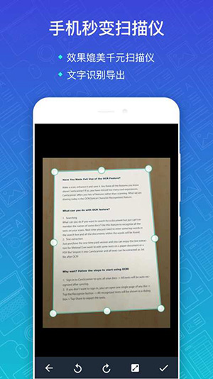 1、手机拍文档,自动去除杂乱背景,生成高清JPG图片或PDF文件;2、扫描全能王官方版APP智能OCR文字识别,手机拍纸质文件;
