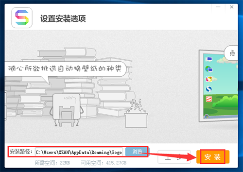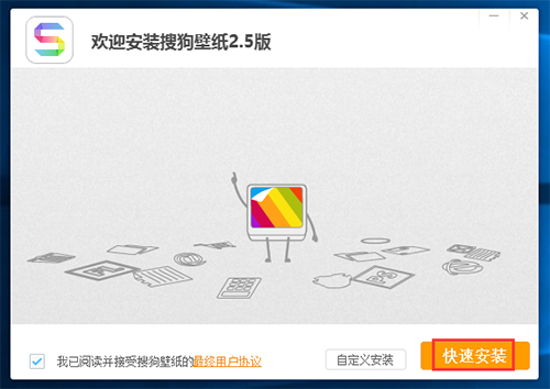 1、在本站下载搜狗壁纸电脑版,解压之后双击.exe,出现一个欢迎安装界面,点击“快速安装”
