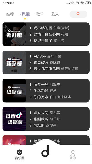 3、用户们可以选择榜单、歌单和艺人等分类来听歌,所有的歌曲都是免费的哟;
