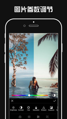 滤镜君支持14种高级参数编辑调节工具:对比度,饱和度,褪色等,释放用户创意。