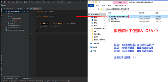 7.进入 IDEA 中, 我们先随便建个 Java 工程, 然后将网盘中最新的 IDEA 破解补丁 jetbrains-agent-latest.zip拖入 IDEA 界面中,如下图所示:
