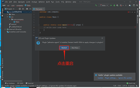 8.拖入补丁后会弹框,点击 restart 重启 IDEA: