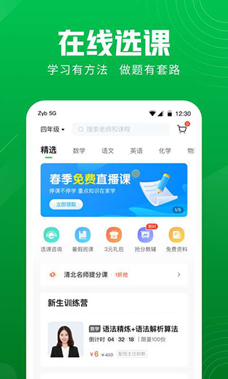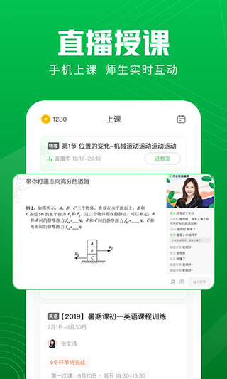1、直播上课,互动教学,还可以课中答题赢学分。2、辅导老师全程伴读,批改作业、语音答疑,个性化指导。