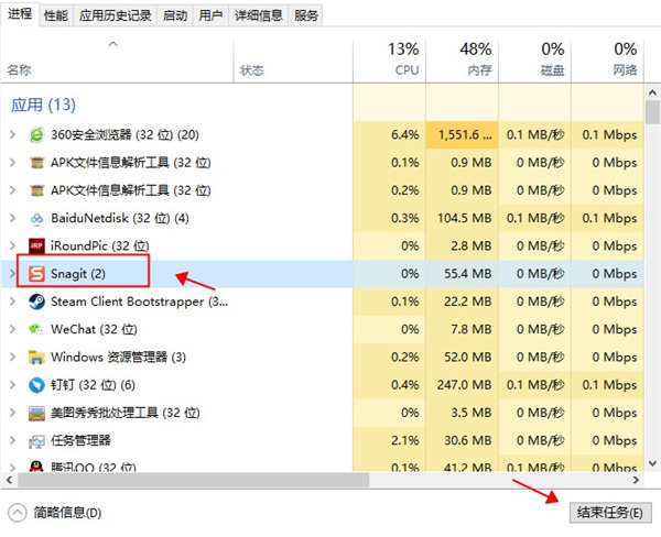 5、先进入任务管理,将Snagit进程结束;