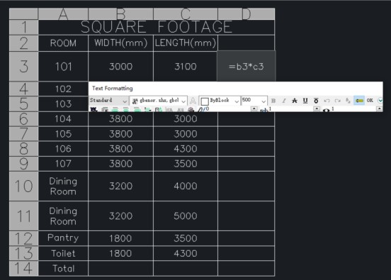 用户可使用表格公式功能,对表格内数据做类似Excel®的运算,如求和,求平均,计数。这个功能能让用户在中望CAD也能轻松创建数据表格。