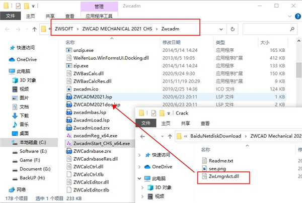 1、下载中望CAD机械版2021数据包,解压数据包的到安装文件和破解文件。