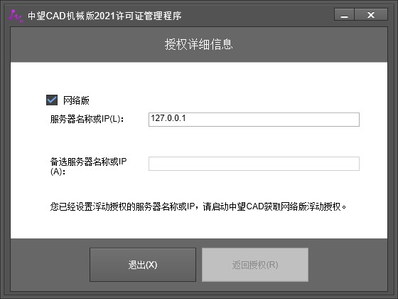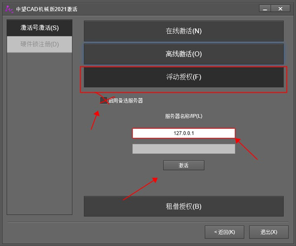 8、选择浮动授权,然后取消勾选启动备选服务器,服务器名称为:127.0.0.1,然后点击激活即可;