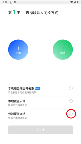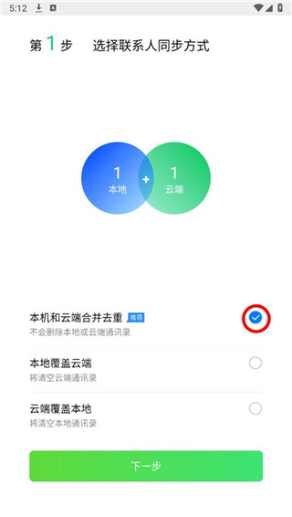 3、第一项合并会自动去掉重复联系人,第二项覆盖则删除云端,等待同步成功。