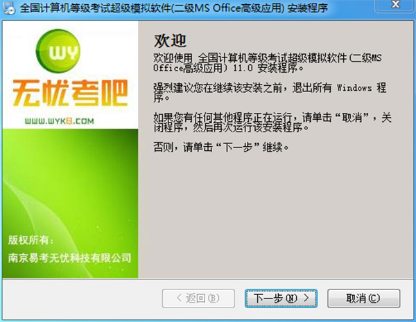 无忧考吧计算机考试20181、在本站下载无忧考吧全国计算机等级二级MS OFFICE超级模拟软件安装包,内含主程序及破解补丁,解压缩并运行主程序开始安装,点击下一步