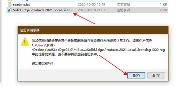 6、双击运行Solid.Edge.Products.2021.Local.Licensing-SSQ.reg,选择是