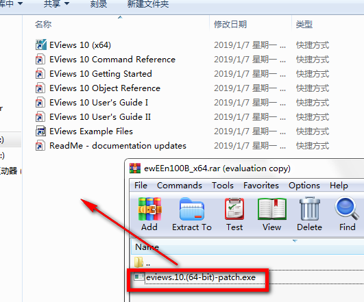 1、首先我们需要找到下载软件包中的 “eviews.10.(64-bit)-patch.exe” 程序,将其复制粘贴到你设置EViews的安装目录中。如下: