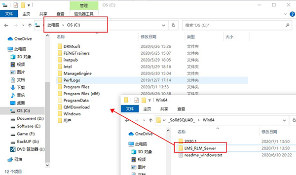 2、首先解压_SolidSQUAD_.7z破解文件,复制LMS_RLM_Server到一个指定位置,建议C盘根目录下;