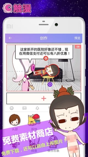【自由创作 秒变大触】不会画画也能成为大触~成千上万的场景、人设、道具、贴图、模板随你pick,脑洞大开任意组合拼贴,即可超低门槛创作漫画小剧场!还有触漫app免费版独家传授漫画创作技巧,助你晋升大触,获得更多人气和好评。
