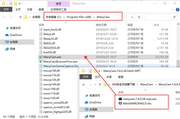 6、然后以管理员的身份运行破解文件“manycam.7.6.0.38-MPT.exe”,弹出下图情况后,点击左边的豹子头图标进行破解。