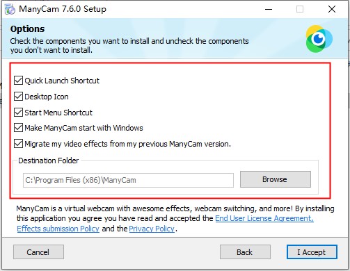 3、然后设置软件安装路径和附加选项,默认安装在C盘,可以更改,确认完安装信息后,点击“I Accept”安装软件;