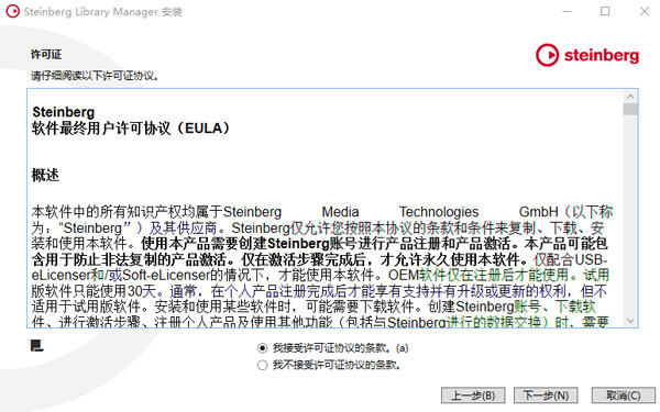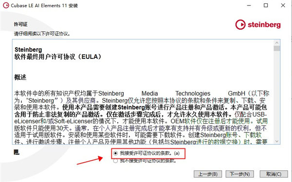 4、接着双击运行“Cubase_LE_AI_Elements_11_Installer_win.exe”安装软件主程序,如上,勾选“我接受...”,点击下一步;