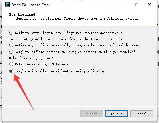 5、等待安装进度条满后会出现如下选项,选择“complete installation without entering license”后点击“Next”进行下一步。