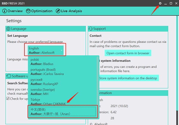 6、进入程序之后默认为英文,点击右上角的齿轮图标,在Set Language选项卡中下拉至最底部选择简体中文