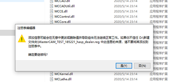 7.这时候不要运行软件,将MultiKey_18.1.1_x64_24032019_testmode文件夹复制到软件安装目录下,再运行MasterCAM_TEST_185221_hasp_dealer.reg添加注册表信息,点击是