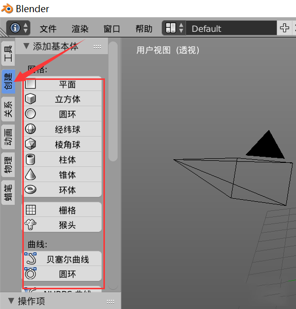 在左边的选项卡上,有创建这个分类,点击创建,然后在栏目上,有平面、立方体、圆环等,这些就是需要创建的物体了